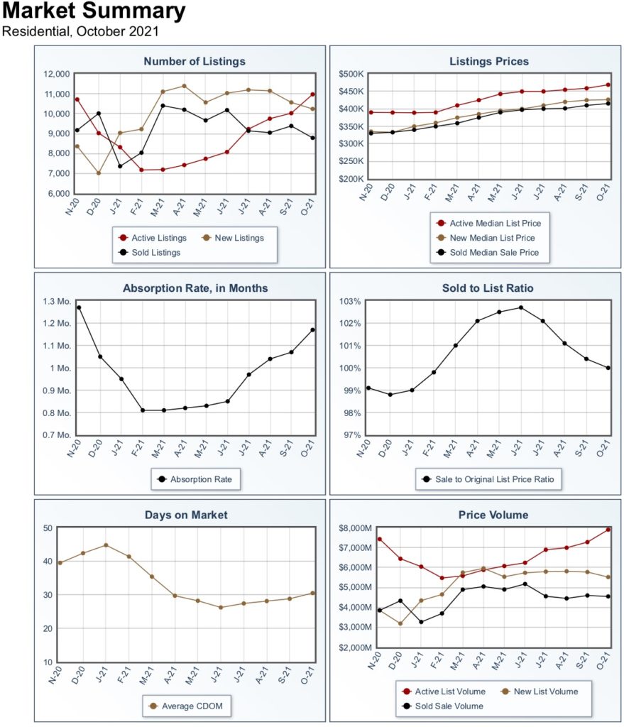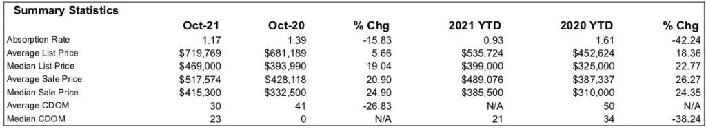 The real estate market in Cielo Noche remains steady as we continue through fall 2021. The average days on market was 30 days, and the average sales price was $517,574. The absorption rate for October was 1.17, which indicates that the supply of homes for sale in Cielo Noche is LOW, and the neighborhood is currently in a “seller’s market.”
